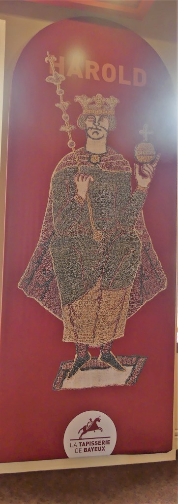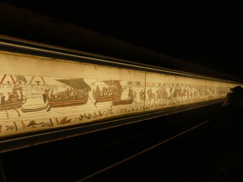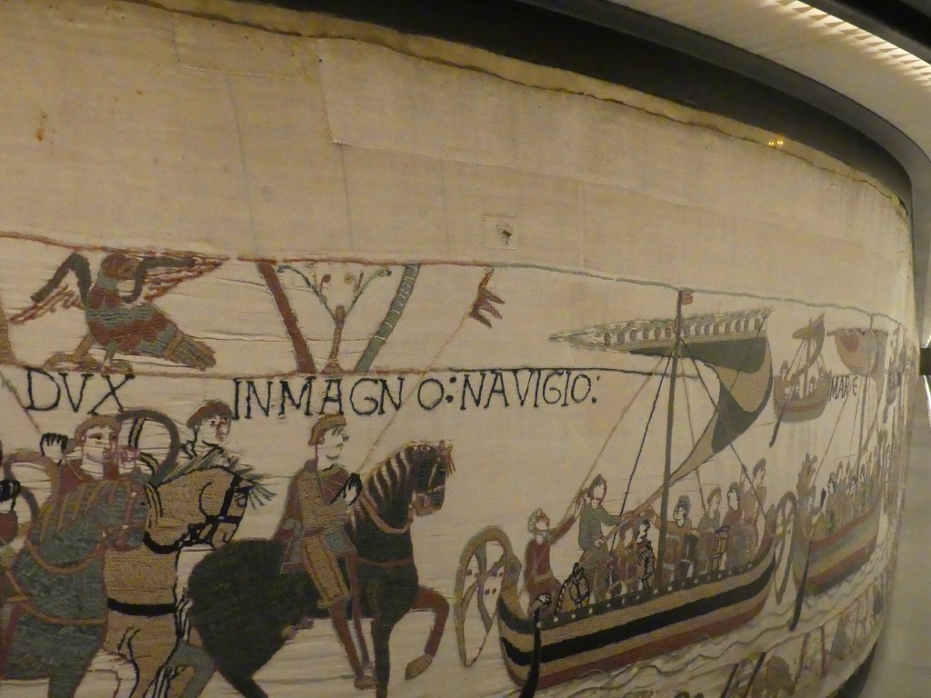 Et voici donc le clou du spectacle, la tapisserie de BAYEUX, bien que son nom ne l’indique pas, est une broderie. 68,3 m de longueur sur 50 cm de hauteur est élaborée vers 1070. Ce témoignage graphique est inestimable en ce qui concerne les moeurs, les costumes, les bateaux et l’architecture. L’UNESCO l’a classé au registre de la Mémoire du Monde.