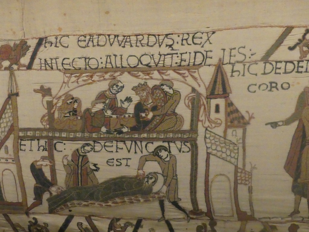 Résumé rapide: Edouard roi d Angleterre, sans descendance, désigne Guillaume, Duc de Normandie comme successeur, et demande à Harold de le reconnaître. Harold accepte. A la mort d’Edouard, les Saxons poussent Harold à devenir roi d’Angleterre. Harold renie son serment d’allégeance et monte sur le trône. Guillaume part en Angleterre avec ses troupes et le 14 octobre 1066 à la bataille d’HASTINGS il défait Harold qui meurt d’une flèche dans l’oeil. Guillaume devient roi d’Angleterre et on le surnomme « le conquérant ».