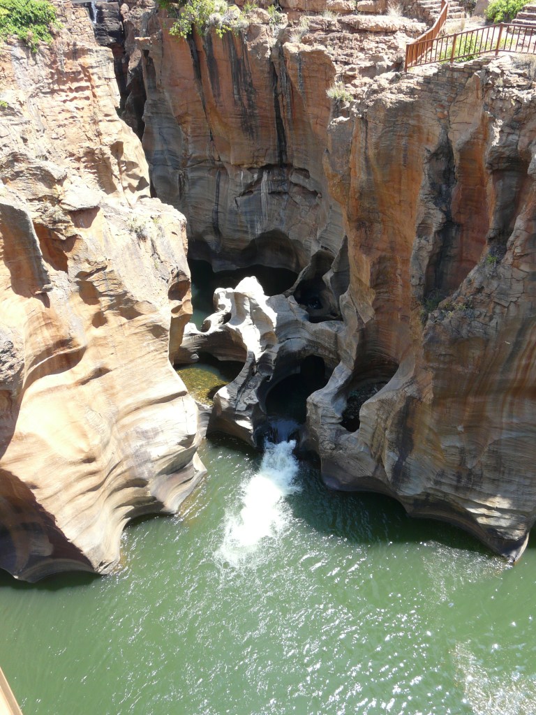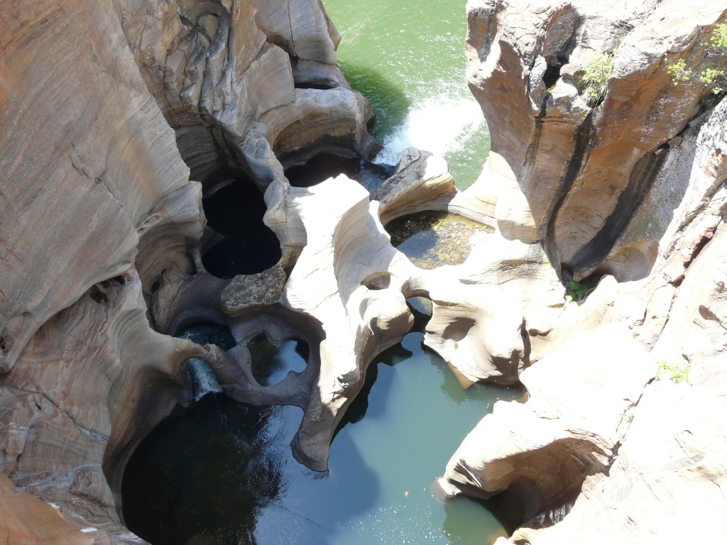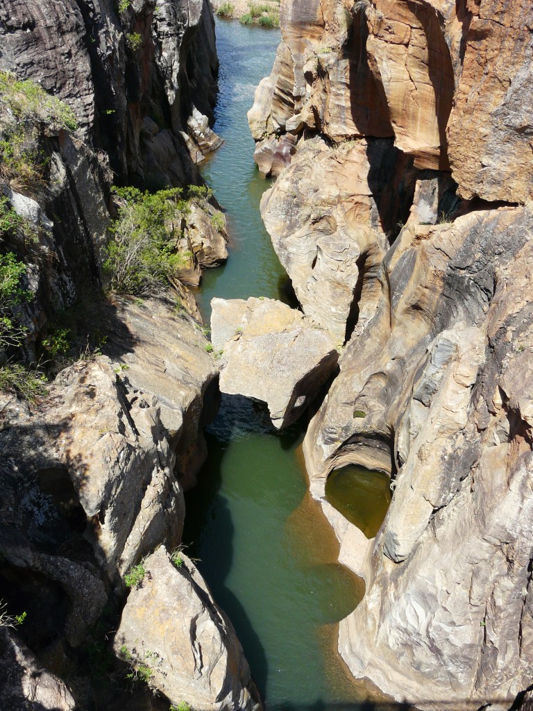 En continuant vers le Nord, nous arrivons à BOURKE’S LUCK POTHOLES. POTHOLES veut dire marmites et on comprend très bien pourquoi. L’érosion due aux tourbillons incessants de la rivière BLYDE à modeler ces marmites circulaires.
